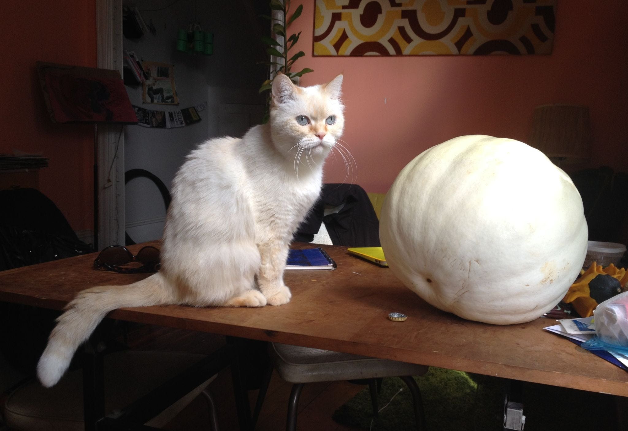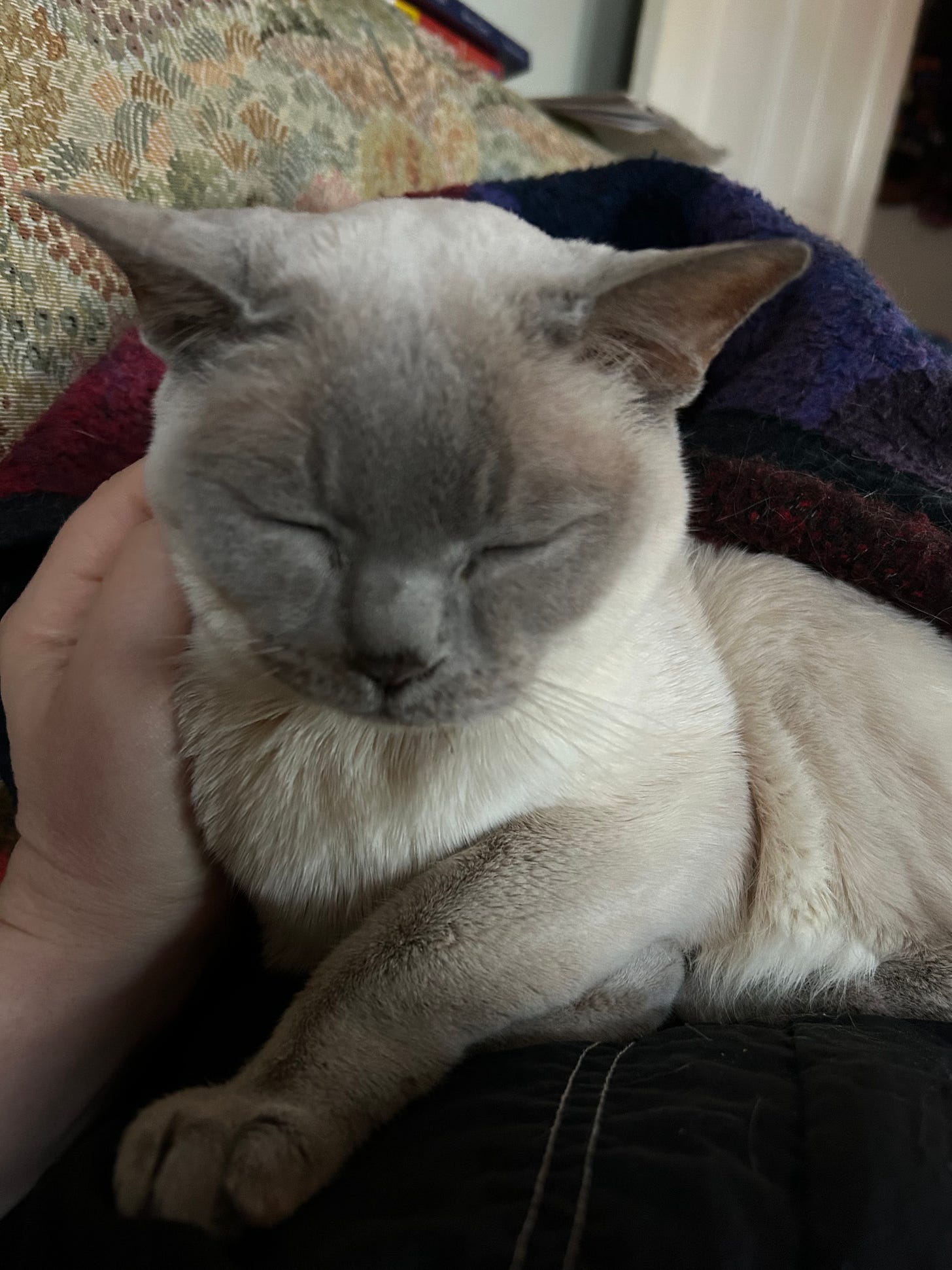 My criteria for cats: I wanted them to be an elderly bonded pair so that I wouldn’t have to have them for too long and could leave them in one another’s care when I traveled. This desire felt evil: that I didn’t want to make a long-term commitment, that I wanted the freedom to abandon my charges, especially since everyone was praising me for being so humane, adopting two 15-year-old ladies. I also didn’t want cats who liked playing; I wanted cats who would just sleep and cuddle. Worse yet, I found the girls by searching for “white cats” because the only cat I had ever bonded with previously was an ancient deity named Helga, who was a white Siamese Flamepoint.