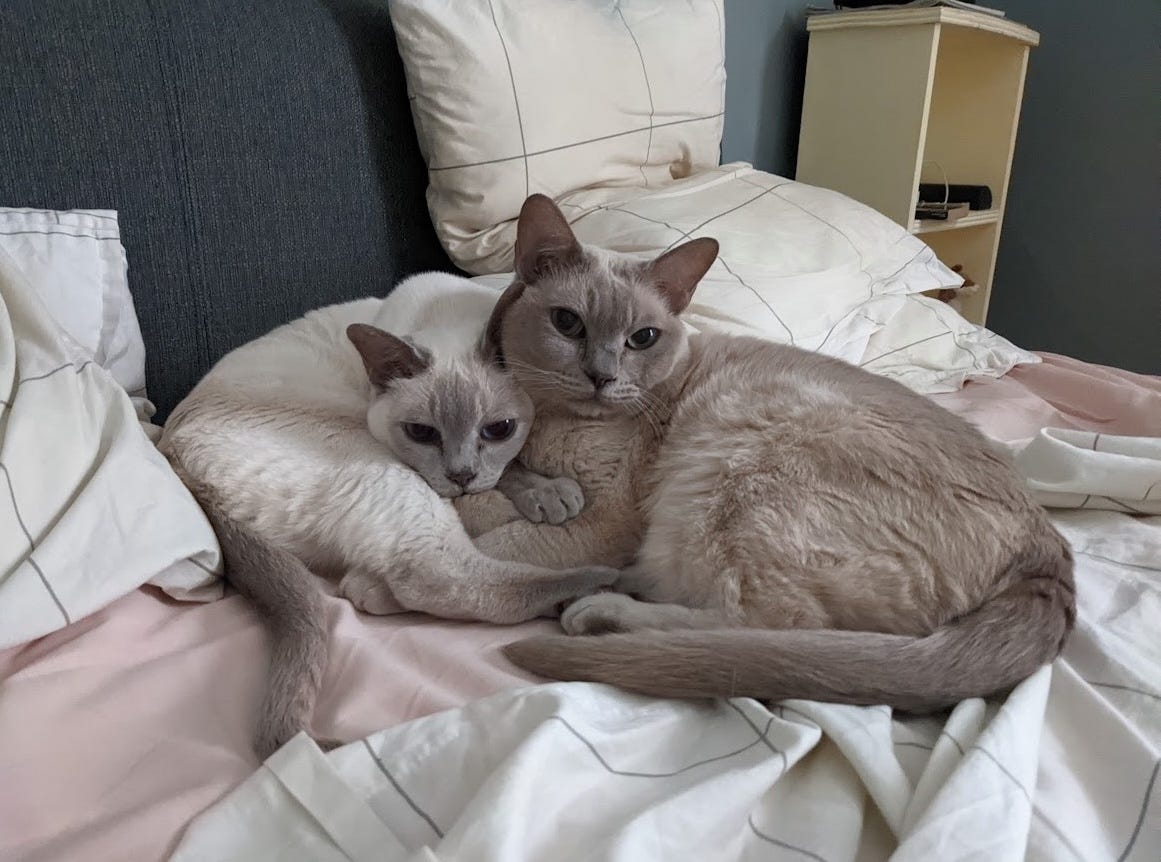 I got my cats Baby and Rascal in 2020. I had just broken up with my partner of four years and was living alone for the first time since I was 21. It was the year that most of my close friends had children. It felt pretty on-the-nose, especially with Baby being named Baby, but I have done plenty of much more humiliating things that have been a lot less rewarding.