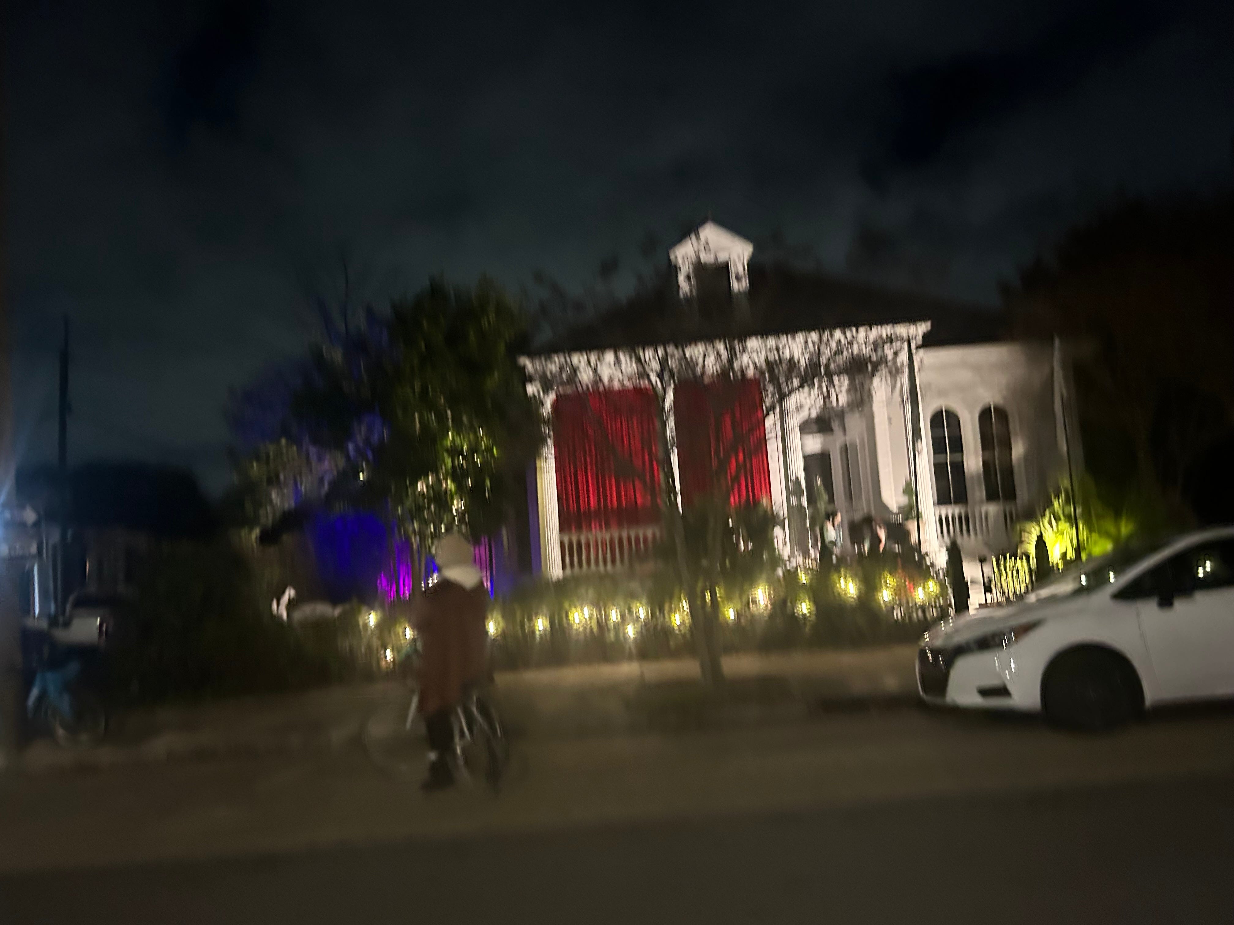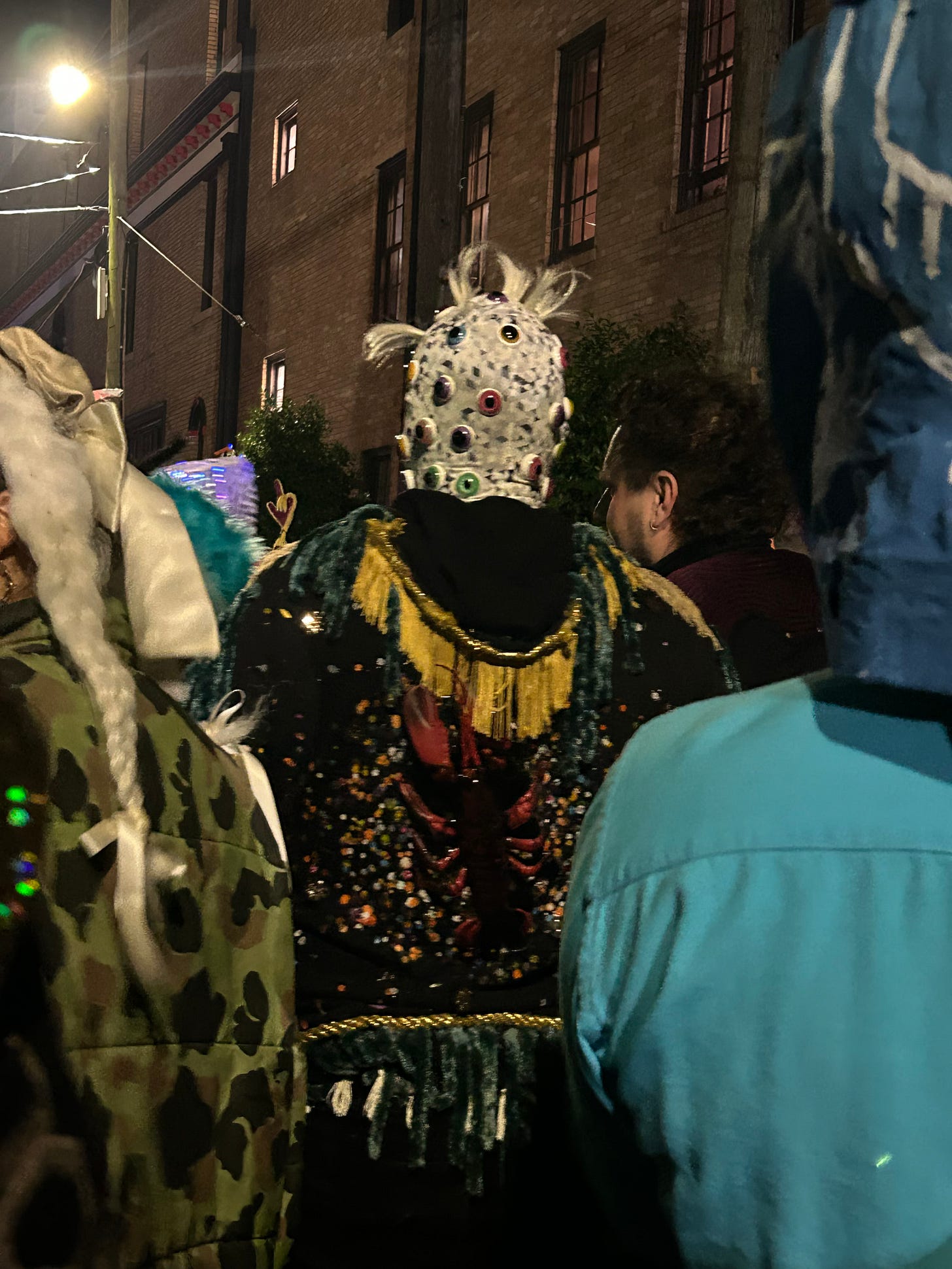 I had to go home even though it was still before midnight. I was self-conscious, not having dressed like a clown. I hadn’t really slept in three days and I was planning to get up at 4 and go to Skull and Bones, the parade of the dead, where men dressed as skeletons march through the streets telling people, “You’re next.” An hour after I got home, the carnival relocated to the intersection outside of my house.